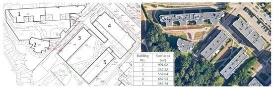 A small-scale housing community, covering a total 13,842 m2 (approx. 1.38 hectare) area covering five blocks of flats located in Lublin, Poland, was selected for this study. The selection of this area, built in approx. 2008–2010, as a typical multi-family housing in Lublin established in last two decades, was related to the area’s lack of sustainable rainwater management, significant share of impermeable surfaces and risk of possible flooding, an example of which occurred in this area in May 2014, resulting in serious street and underground parking lot flooding [95,96]. The spatial arrangement of the studied urbanized catchment, together with the roof areas of all included buildings, is presented in Figure 2. The following components constituted the studied area: buildings roofs—3078.74 m2, grass—3901 m2, roads and pavements—3499 m2 and 3364 m2—high vegetation. All the studied buildings have the same construction, i.e., concrete frame structures that are flat, have an inclination that is lower than 5 degrees and have roofs covered with bituminous roofing felt. There are two underground parking lots, of a total area of 6118 m2, available for the residents.