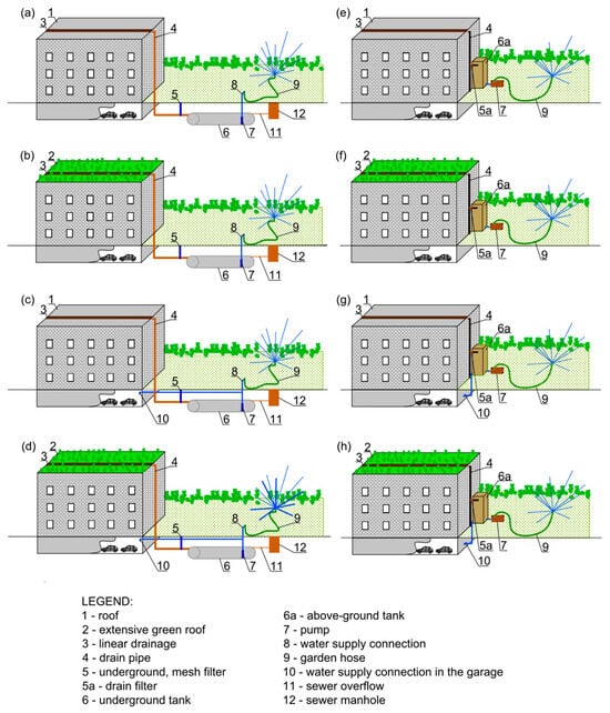 The developed variants of possible rainwater management in the studied urban catchment, utilizing the rainwater harvesting (RWH) and/or green roofs considered in this study, are presented in Table 1 and in Figure 3. Calculations of the available rainfall runoff volume collected from roofs were based on the assumed mean annual rainfall depth of 600 mm [97], a runoff coefficient for flat roofs covered with bituminous roofing felt of ψ = 0.8 and a runoff coefficient for extensive green roofs of ψ = 0.5 [98,99]. The proposed methods of sustainable rainwater management for housing communities were assumed to be operational only during the warm part of year.