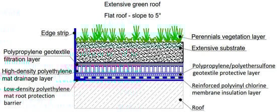 As is visible in Table 1, four assumed variants of sustainable rainwater management, i.e., Variants 2, 4, 6 and 8, covered the application of extensive green roofs of a total area 2616.93 m2. Extensive green roofs of the following typical construction (see, also, Figure 4) were assumed in this study [84]: (i) perennial vegetation layer, (ii) 8 cm of commercially available light bulk density, 0.83 kg/dm3 density, extensive substrate, in agreement with German FLL and GRO UK green roof guidelines [104,105,106], (iii) polypropylene geotextile filtration layer, (iv) high-density polyethylene drainage mat drainage layer, (v) polypropylene/polyethersulfone geotextile protective layer, (vi) reinforced polyvinyl chlorine membrane insulation layer and (vii) low-density polyethylene mat root protection barrier.
