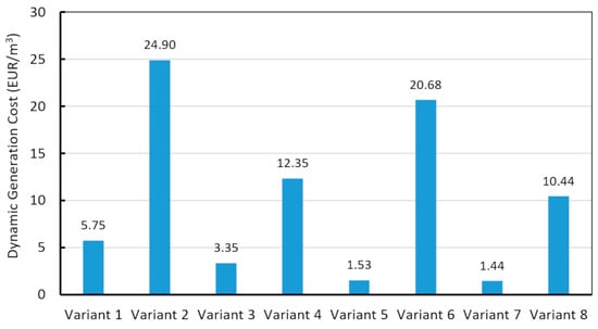 The determined cost-efficiencies of the proposed possible systems of sustainable rainwater management, based on rainwater harvesting and extensive green roofs application and characterized by Dynamic Generation Cost indicator values, are presented in Figure 5. It can be seen that the investments’ cost-efficiencies, measured by the price of the ecological effect, i.e., 1 cubic meter of retained and reused rainwater, are extremely different, from 1.44 EUR/m3 to 24.90 EUR/m3. Thus, the cost-efficiency of the proposed designs of sustainable urban rainwater management is highly dependent on the assumed technologies of rainwater collection, retention, reuse and the assumed demand for non-potable rainwater. Only two variants, Variant 5 and 7, assuming an application of the RWH system equipped with above-ground rainwater reservoirs and using rainwater for watering green areas and flushing the floors of underground parking lots, achieved a satisfactory cost effectiveness, allowing for unit costs lower than the usage of tap water (as was mentioned above, the actual price of tap water in the region reaches a level of 2.18 EUR/m3, with sanitary sewage included). The highest cost-efficiency, determined by the lowest value of the calculated DGC indicator, was observed for the technically simplest variants in which minimal investment and O&M costs were possible. In the other cases, the proposed designs generate costs higher than the usage of tap water for watering grass and washing parking lots. The low cost-efficiencies in these cases are related, in our opinion, to (i) higher investment costs covering required earthworks for underground rainwater reservoirs and green roofs installation, together with the required equipment and (ii) higher operation and maintenance costs related to services and energy consumption. It is worth noting that the costs are very high for the assumed ecological effect for Variants 2 and 6, assuming a combined application of extensive green roofs and a rainwater harvesting system and the use of retained water only for watering green areas.
