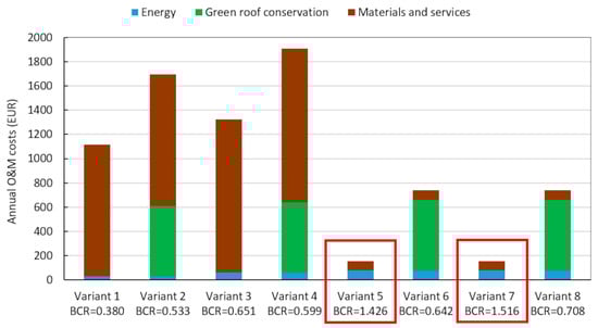 Figure 8 and Figure 9 indicate that the economic profitability was determined for variants for which the combined investment and O&M costs were the lowest. Considering the investment costs of the studied variants, with the comparable costs of rainwater reservoirs and the required earth and installation works, the decisive factors were the cost of green roofs (see Figure 8). For example, the investment costs of Variants 5 and 6, covering the same volume of above-ground rainwater reservoir and assuming the usage of stored rainwater for green area watering, differ only in the cost of extensive green roofs, but this difference results in a significantly different assessment of their profitability. The same situation was observed for Variants 7 and 8. The analysis of O&M cost components presented in Figure 9 shows that the highest economic efficiency was obtained by designs without green roofs and with above-ground rainwater reservoirs for which different equipment, spare parts and services are required. Variants 1–4, based on underground rainwater reservoirs, booster sets, submersible pumps and water filters, required significantly higher servicing costs to sustain their operation during the assumed time duration of the investment.