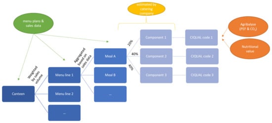 In the initial phase, we identified the various components presented in each menu option and assigned specific quantities to each component. These quantities were estimated by the (catering) company, providing insights into the approximate portion sizes for each component typically found on the plate. The correlating CIQUAL code was determined using the ANSES-CIQUAL nutritional database and the Agribalyse database [,]. This CIQUAL code represents a unique code given to each food item, allowing LCA practitioners to easily extract both environmental and nutritional information from these databases. The environmental footprint and carbon impact were then calculated for each meal by weighting the component’s influence on each meal. From that result, the environmental impact as well as the nutritional value for each menu line in the two canteens was then calculated. Adding sales data for the different menu lines made it possible to calculate the average impact for each of the canteens and a total average for both canteens (see Figure 1).