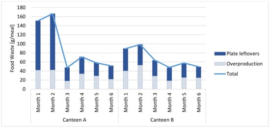 The implementation of waste reduction measures resulted in an overall reduction in food waste from 742 kg in November 2022 (subsequently named month 1) to 399 kg in April 2023 (subsequently month 6), thus resulting in food waste savings of 343 kg. The trend of reduction, however, is not linear, exhibiting some variation throughout the observed period. Figure 2 illustrates food waste quantities for canteens A and B in grams per meal over consecutive months. This chart highlights the contribution of different sources to food waste.
