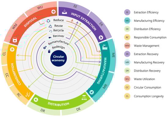 - Jawahir, I.S.; Bradley, R. Technological elements of circular economy and the principles of 6R-based closed-loop material flow in sustainable manufacturing. Procedia CIRP 2016, 40, 103–108. [Google Scholar] [CrossRef]
