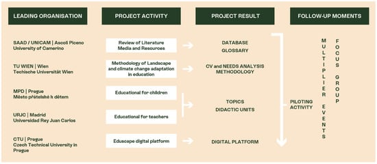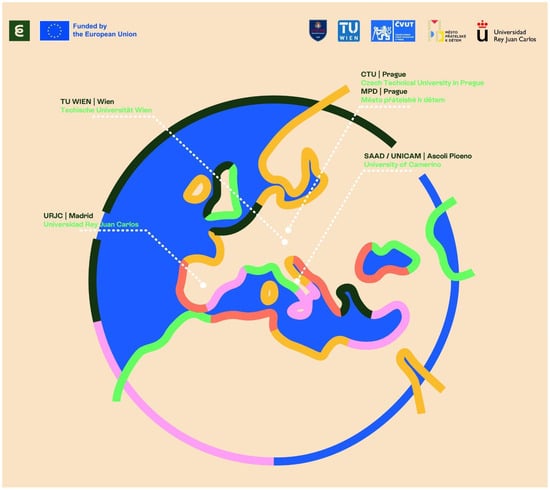 The EDUSCAPE project “Landscape and Climate Change Adaptation in Education” (www.eduscape.online accessed on 29 December 2023) is articulated on these theoretical bases and fits into the framework of the Erasmus+ program, involving five partners: the Czech Technical University (CTU—CZ) (lead partner), the University of Camerino (UNICAM—IT), the Universidad Rey Juan Carlos (URJC—ES), the Technische Universität Wien (TU Wien—AT), and the Child Friendly City (MPD—CZ) (Figure 1). These are joined by a network of associated partners (educational institutions)—at least one per country—who will act as a bridge for the direct testing of the project results.