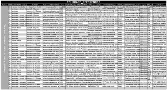 The database (Figure 4) was structured in a way that makes it easy for teaching staff and experts in the field to consult it by means of data-based filters and queries with respect to the topic of interest (landscape, climate change, adaptation to climate change, pedagogy, and education) and/or the project glossary (biodiversity, education for sustainable development ESD, engagement, European citizen, experience-based teaching, global citizen, heritage, innovative instruments, literature review, ready-to-use teaching materials, etc.), the user target, and/or the type of document surveyed.