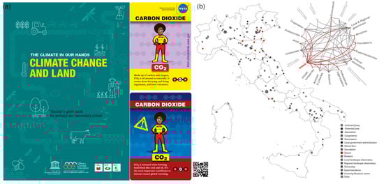 Examples of materials and case studies from the literature review: (a) excerpt of downloadable open access playing cards for teachers/students about greenhouse gases emitted by anthropogenic activities [44] and (b) the mapping of schools and stakeholders promoting landscape education in schools in Italy, an excerpt from the ‘Raccontami un Paesaggio’ project [5]. Source: authors’ re-elaboration (credits to the authors of data).