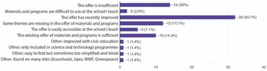 With regard to the analysis of the curricula of each school level, the partners noted an increase in interest in the project topics in the four target countries (Italy, Austria, the Czech Republic, and Spain). This process was also supported by dedicated laws and reforms, starting from the addresses of the 2030 Agenda. In Italy, the teaching of “civic education” (Law 92/2019) [46] was established; in Spain, the Lomloe (Ley Orgánica 3/2020) [13,47] was enacted; in Austria, the teaching of “general studies” is underway; and in the Czech Republic, a revision of the national educational offer is underway.