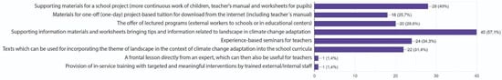 To finalize the NA, the individual partners administered two questionnaires online and/or in paper format to schoolteachers in the 6–15 age group and to professionals in the field whom they were able to intercept on the basis of their personal knowledge, research network, and contacts identified through the LR or via social networks (Facebook and Instagram). A total of 92 teachers responded. The level of interest, expertise, or predisposition to the proposed topics among the different countries was rather homogeneous. The responses generally returned a positive attitude to the integration and deepening of landscape and climate change issues. In addition, teachers hint at the fact that PBL methodology is not (or not fully) integrated into school curricula yet. Nevertheless, the responding teachers are convinced of the pedagogical value of such learning and teaching formats.