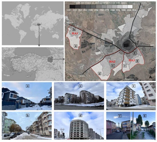 Three different housing areas with different morphological patterns were selected as the study area in Erzurum’s city centre, situated in the north-eastern part of Turkey (39°55′ N, 41°16′ E). Erzurum is one of the cities exposed to the largest amount solar radiation, depending on several factors (e.g., elevation; the actinometrical value is 141 kcal/cm2). The long-term (1991–2020) mean annual temperature is 5.8 °C, the ever-recorded maximum temperature is 36.5 °C, and the sunshine duration is 11 h. Three different housing areas were selected for the study, which were developed in different time periods and have different structural characteristics and morphological patterns. Study areas were determined as the housing areas of Dadaşket (northwest), Yenişehir-Yıldızkent (southwest), and Kayakyolu (southeast; Figure 1).