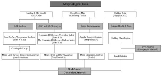 Research has consistently highlighted various factors influencing UHIs, including climatic components, land surface characteristics, and notably, urban morphology [13,14]. While existing studies have primarily concentrated on the influence of climatic components and land surface characteristics on UHI formation, the role of urban morphology has emerged as a crucial factor driving UHI formation and expansion [15,16,17]. These morphological aspects significantly impact surface temperature [18,19,20,21,22,23,24], highlighting the importance of land use changes, impermeable surfaces, and vegetation cover in contributing to the UHI effect. However, while progress has been made in understanding the macro-scale relationship between urban morphology and UHIs, the microscale impact, particularly the influence of street network pattern, building form, and height, often remains overlooked in many cases.