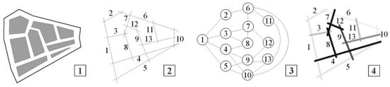 - The street pattern (1) is transformed into an axial map (2), which is, albeit not precisely a graph, still a rudimentary representation.