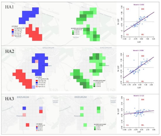 LISA analysis using the Global Moran Index was performed to determine the distribution pattern of LST within the three HAs. This method provided an indication of whether LST values were clustered or dispersed across these areas. The high-high and low-low grid designations denoted spatial clusters, indicating areas where both the grid itself and its surrounding grids had either high or low LST values. Conversely, the high-low and low-high designations signified spatial outliers, representing grids with contrasting LST values compared to their adjacent areas [85]. The colourless dots on the analysis map indicated grids without statistically significant clustering or outlier characteristics relative to their surroundings.