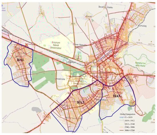 Figure 6 illustrates the integration index of Erzurum’s street network, representing a spectrum of integration values in different shades from light to dark, depicting a range from low to high integration. Notably, the main axis indicated a higher level of integration, which gradually decreased towards the periphery of the city. The three HAs revealed differences in integration indices. HA1 presented integrated areas in the northern and southern regions, with integration decreasing towards the periphery. A noteworthy feature of HA2 was the high rate of integration, which could be attributed to the grid street network design aligned with the prevailing wind direction. The southern area of HA2, which is experiencing rapid urban expansion, displayed amplified integration as a result of planned boulevards. Conversely, in HA3, there was a higher level of integration in the unplanned northern sectors, with a corresponding decline as progress was made towards the southern areas.