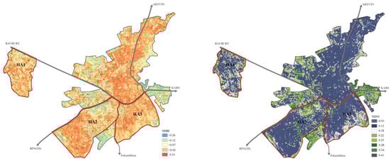 The NDBI value lies between −1 and 1. Larger values represent build-up areas. The NDBI value for vegetation is lower.