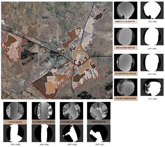 Building heights and forms were classified into eight categories, comprising irregular houses, detached houses, traditional Erzurum apartment houses, courtyard blocks, linear blocks, mid-rise apartments, high-rise apartments, and point blocks. Sky View images were captured at eight different control points, each of which represented a different building height and form, for the SVF analyses.