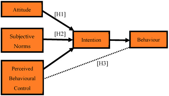 It is a social-psychological theory that is used to quantify and describe how human acts are driven [30,43]. TPB is the most commonly used way of explaining human behaviour [44]. One of the advantages of TPB relates to the possibility of increasing its potential to predict behaviour [45]. It emphasises the importance of the individual’s attention and action while also understanding and predicting their attitude [46]. People’s social behaviour is under the control of certain factors, resulting from certain reasons, and occurs in a planned way, according to the TPB. The goal of the behaviour can be measured, and the probability of its occurrence can be determined with TPB [47].