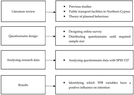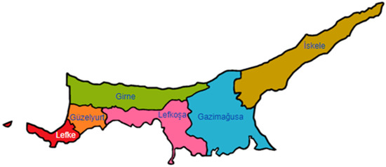 Cyprus is an island situated in the Eastern Basin of the Mediterranean Sea, with an area of 9282 km2. It is located to the south of Turkey, west of Syria, and north of Egypt. It is the third-largest island in the Mediterranean, after Sicily and Sardinia, respectively [53]. Northern Cyprus has an area of 3355 square kilometres, which amounts to around a third of the island, and is divided into six districts: Nicosia (Lefkoşa), Famagusta (Gazimağusa), Kyrenia (Girne), Morphou (Güzelyurt), Trikomo (İskele), and Lefka (Lefke), as shown in Figure 6 [54]. PT operators and managers should develop a user-oriented strategy in order to attract existing PT users. For this reason, passenger behaviour and psychological perception are significant [55]. This research started by using the TPB model developed by Ajzen in 1985 to examine the PT usage intention in Northern Cyprus. It is necessary to better understand the psychological factors to encourage more passengers. For this reason, the authors preferred to use the TPB model. Figure 5 describes the research process for the study.