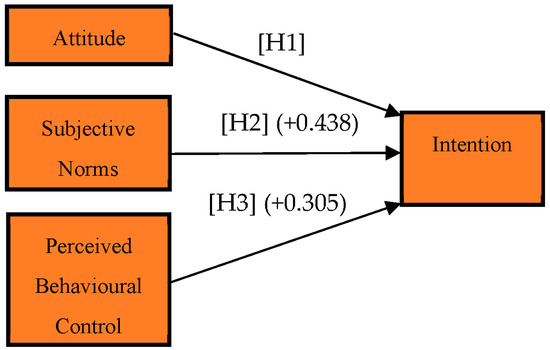 The correlation between attitude, subjective norms, and perceived behavioural control with intention is depicted in Figure 4. The figure also shows the impact of perceived behavioural control and intention on behaviour.