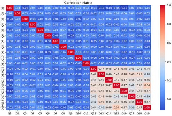 Initially, the analysis revealed that gender (Q1) exhibited relatively weak correlations with other factors, with the highest correlation coefficient at 0.055780 (see Figure 1). This suggests that gender is only weakly associated with the other variables. While the analysis did not reveal strong gender-related correlations, it does not necessarily imply that gender has no impact on other factors. Further investigation may be warranted in this regard.