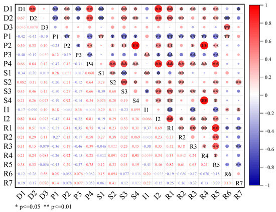 Utilizing the Pearson correlation coefficient method [41], 17 indicators with strong correlations were screened out, except D3, R6, and R7 (Figure 2), culminating in the establishment of a resilience evaluation indicator system for rural human settlements.