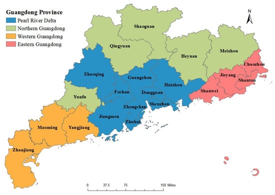 Guangdong Province is situated in the southernmost part of mainland China and covers a total area of 179,800 square kilometers. It administers 21 cities. The terrain exhibits higher elevations in the north and lower elevations in the south, characterized by predominantly mountainous and hilly landscapes in the northern part and plains and plateaus in the southern part. The provincial area is categorized into four regions based on economic development, regional characteristics, and main functions, namely the Pearl River Delta, Eastern Guangdong, Western Guangdong, and Northern Guangdong, as illustrated in Figure 3. Guangdong Province places significant emphasis on the improvement of rural human settlements. Since 2017, the provincial government has earmarked CNY 160 billion over a 10-year period for rural human settlements’ improvement and infrastructure construction, culminating in the establishment of the “Guangdong experience” in rural human settlements’ improvement. However, notable development disparities exist among different regions, and deficiencies persist in rural human settlements. Taking into account factors such as geographical location, economic development level, rural management proficiency, and administrative traditions, the efficacy and limiting factors of rural human settlements’ improvement closely align with the focal points of this study. Therefore, Guangdong Province was selected as the research subject. Given the substantial number of administrative villages and considerations regarding the feasibility and accuracy of obtaining statistical data, this study adopts county-level administrative divisions as the fundamental research units.