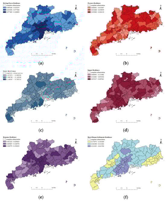 (a) Spatial distribution characteristics of driving force resilience; (b) spatial distribution characteristics of pressure resilience; (c) spatial distribution characteristics of state resilience; (d) spatial distribution characteristics of impact resilience; (e) spatial distribution characteristics of response resilience; (f) spatial distribution characteristics of rural human settlements’ resilience.