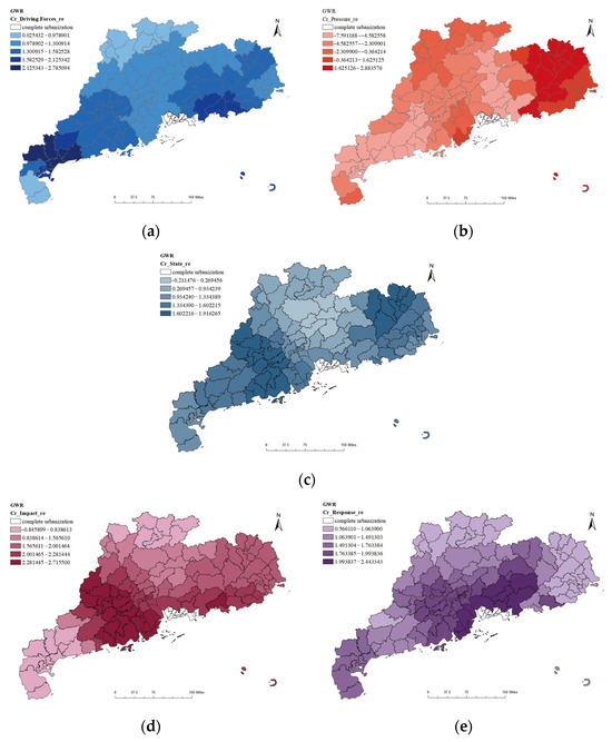 (a) Coefficient spatial distribution of driving force resilience index; (b) coefficient spatial distribution of pressure resilience index; (c) coefficient spatial distribution of state resilience index; (d) coefficient spatial distribution of impact resilience index; (e) coefficient spatial distribution of response resilience index.