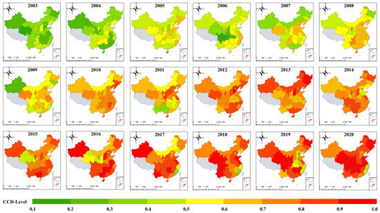 The degree of coupling model and coupled coordination model were used to measure the coupling and coordination degrees of the WEF system in China from 2003 to 2020. The results are shown in Figure 1. Overall, the coupling and coordination index of the WEF system at the provincial level in China has shown a steady upward trend, except for a slight decline in 2010–2011 and 2013–2014. This indicates that the regional connections and coordination levels of the provincial-level WEF system in China are gradually increasing. The average degree of coupling and coordination has increased from 0.210 in 2003 to 0.911 in 2020, with an annual average growth rate of 10.51%. This means that the coordination level of the provincial-level WEF system in China has changed from a state of serious imbalance to a state of high-quality coordination, showing the gradual strengthening of regional connections. There are significant differences in the level of coupling and coordination of WEF systems between regions, with overall distribution patterns of south > north and east > west. In 2003, most regions in the country were in a state of serious imbalance in terms of coordinated development, with only Hainan in a state of barely coordinated development. From 2003 to 2010, the index of coupling and coordination of the WEF system increased rapidly, with an annual average growth rate of 20.10%, and the overall coordination level significantly improved. In 2010, all regions in the country had a level of coupling and coordination at or above a barely coordinated state, with Jilin, Liaoning, and Jiangxi in a state of good coordination. In 2011, due to persistent drought and less precipitation, the comprehensive evaluation index of the water resources subsystem decreased significantly (Figure 1), which led to a slight decline in the coupling and coordination degree of the WEF system. From 2015 to 2020, the overall growth rate slowed significantly, with an average annual growth rate of 4.01%.
