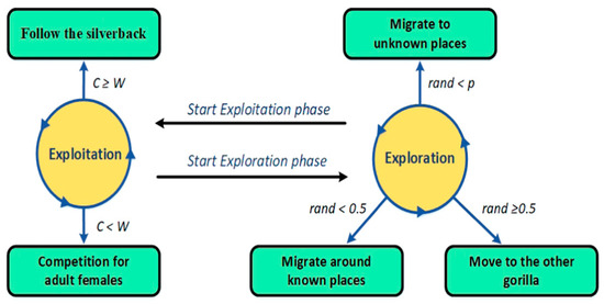 This section presents a modern metaheuristic algorithm based on gorillas’ group behavior, which is called GTO, which illustrates five distinct operators that explain the two phases of the GTO Algorithm (exploration and exploitation), as indicated in Figure 2. There are three operators in the exploration phase while there are two operators in the exploitation phase.