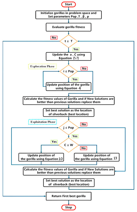 The optimization space flowchart of the GTO method is shown in Figure 3. The GX is the gorilla candidate position vector, which is formed in each phase and operates in the event that it outperforms the current one. The X is known as the gorilla position vector. The silverback, the best answer, is presented on each iteration. There is just one silverback in the population as a result of the quantity of search agents used for optimization activities. Gorillas live in social groupings in the wild. There are three types of solutions based on X, GX, and silverback. Providing better food or establishing a fair and robust group can increase a gorilla’s power. In the GTO algorithm, solutions are generated in each iteration called GX. New solutions (GX) replace existing ones (X) if they are new. In any other case, it will remain in memory (GX). It is impossible for gorillas to live on their own because of their tendency to live in a communal manner. The algorithms can be widely applied because GTO’s unique features make it effective in several optimization issues given the basic concepts of gorilla group life.