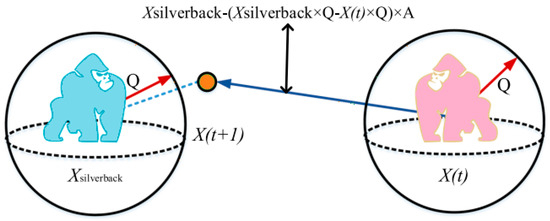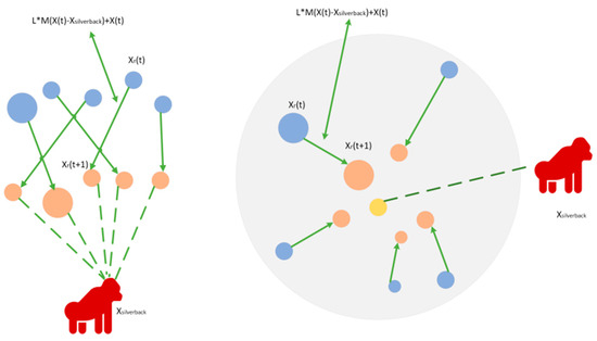Gorilla males follow the silverback’s instructions to search for food supplies in a variety of locations. The movement of the group may also be influenced by each member. This behavior is simulated using Equation (10). Figure 5 shows this process.