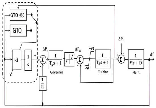 Recently, conventional methods for generating power, especially from fossil fuels, are the primary problems concerning climatic conditions [1,2]. There is a strong interest from scientists and researchers to focus on the conservation and generation of energy through green energy resources (RE) such as solar (e.g., PV, CSP), hydrogen [3] and wind [4]. REs have advantages, including that they are free and economical, and play a crucial role in promoting environmental sustainability, reducing greenhouse gas emissions and ensuring a reliable and clean energy supply for several agricultural and industrial activities. According to [5], solar PV succeeded in reducing the emission of 270 million tons of CO2 in 2021. In addition, in some areas, solar PV can be used to reduce air pollution by up to 30%, as concluded by [6]. Compared with conventional power sources, no water is needed in the PV operation and this acts as a water-saving factor [7]. RE resources are not feasible to be used as a single source of power due to their intermittent nature. Because of this, controllable energy storage technologies (ESTs) are commonly deployed with renewable energy sources [2,4]. The use of thermal energy, which previously predominated, is likely to decline in the future while the use of renewable energy is expected to increase. Additionally, a study into the microgrid’s frequency control is important because of its high absorption capacity and possible effect [8]. For the purpose of integrating RESs into the grid at the distribution level, MGs would offer an appropriate infrastructure. MGs may function in either islanded or grid-connected modes. They might face difficulties controlling frequency and voltage in islanded mode, though. Due to the low grid inertia, these issues would be more severe in MGs with a high percentage of power-electronically interfaced DERs. Actually, power imbalances in low-inertia MGs cause abrupt frequency fluctuations that might risk system stability. Therefore, in an isolated μG, it is crucial to use a controller that is robust and performs well under a variety of conditions [9]. Load frequency control maintains the balance of the power system within specified parameters within which it deviates from its nominal value and in accordance with a practically acceptable dynamic performance [10,11]. The μG operates in two modes (on grid and off grid). In off-grid mode, energy sources, synthetic virtual inertia, and energy storage terminals (ESTs) are often employed techniques to sustain frequency [12,13]. However, the capacity of one μG is constrained and susceptible to a variety of nonlinear random fluctuations impacts [13,14].