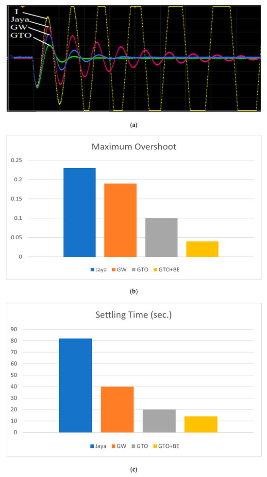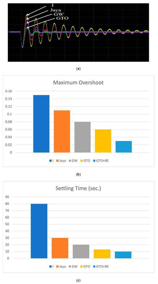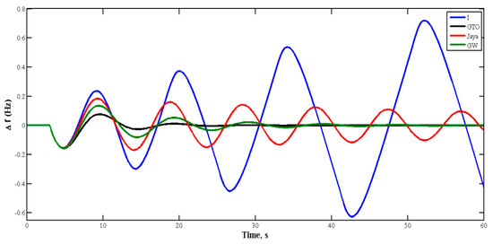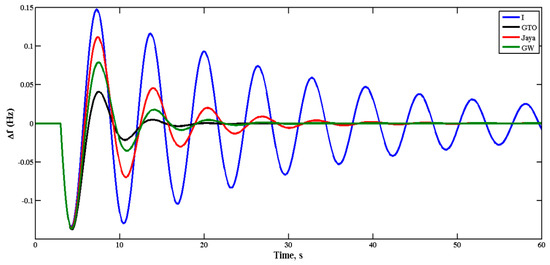Table 2 contains a list of the employed GTO’s stated specifications. Table 3 contains a list of the employed GWO’s defined parameters. The parameters of the Jaya optimization employed are listed in Table 4. The system frequency deviation change is depicted in Figure 10 for four different scenarios: the adaptive integral controller utilizing adaptive Grey Wolf Optimization (GWO), the adaptive integral controller using GTO and the adaptive integral controller using conventional the Jaya optimization approach provided in [38]. The system frequency deviation changes after using GTO and utilizing the suggested GTO + BE is depicted in Figure 11. It can be shown that, when employing the standard GTO, Mp has been reduced to around 20% in comparison to the value produced when utilizing the Jaya method and Grey Wolf Optimization (GWO), while there is not quite an overshoot with the suggested GTO + BE.