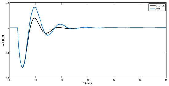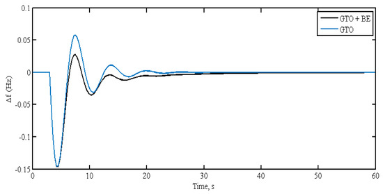 System response for case 1, frequency deviation by using GTO and GTO + BE.