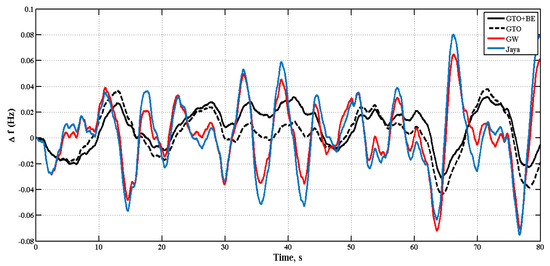 In this case, the system with the suggested (GTO + BE) adaptive controller has been tested in the face of system parameter variation. The power system’s time constant is increased by a factor of 200%, D is decreased to 0.08 pu MW/Hz, and the time constant is increased by a factor of 200%, as well. Figure 12 illustrates the system response obtained using four different controllers (I, I adjusted by Jaya Algorithm [38], I adjusted by GWO [37], and I adjusted by GTO). Comparing the situation of the system responses determined by (I tuned by GTO and I tuned by (GTO + BE)) is shown in Figure 13. These results show that, whereas systems with I adjusted by Jaya, GWO, and GTO can successfully manage these issues, the frequency response of the fixed parameter I controller is unacceptable. Furthermore, the system utilizing the suggested GTO + BE provides optimal time responsiveness and high performance.