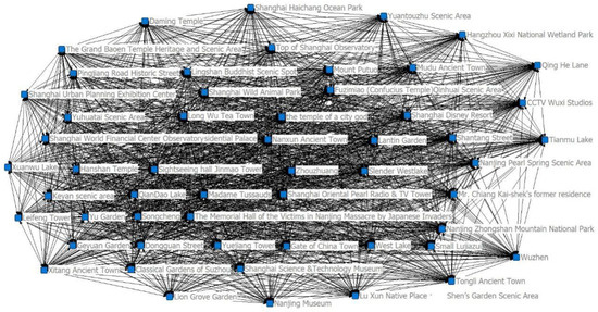 Based on the modified GM, the cooperative gravity values of 55 tourist attractions in the YRD were calculated, and a cooperative relationship matrix of tourist attractions was constructed. According to this matrix, Netdraw, a visualization tool in Ucinet 6.0 software, was used to build a cooperation network of 55 tourist attractions in the YRD (Figure 2). Through the network diagram, we found that there were no isolated phenomena in the development of tourist attractions, and there was an obvious correlation in space; that is, there was a cooperative relationship among all the tourist attractions.