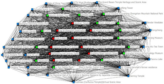 Continuity analysis was used to quantitatively analyze the core, semi-peripheral, and peripheral structures, using the Ucinet 6.0 software Network/Core–Periphery program for this purpose. The results (Figure 3) show obvious hierarchical differences in the cooperation network structure. From the perspective of the spatial distribution, the core members (red spots in Figure 3) are mainly distributed in the eastern region of the YRD’s urban agglomeration, which comprises 11 tourist attractions in Shanghai and Suzhou. Because Suzhou is close to and driven by Shanghai and relies on its own tourism resource quality and tourist attention, it has great cooperation advantages in the network structure. It has frequent tourism exchanges and cooperation with other tourist attractions, which often produce spillover effects on the tourism economy for tourist attractions in surrounding cities. It also plays a core role in tourism cooperation in the YRD. Thirteen tourist attractions (green spots in Figure 3), including Tongli Ancient Town, constitute the semi-peripheral area concentrated in southern Jiangsu, northern Zhejiang, and a part of Shanghai. The peripheral members (blue spots in Figure 3) are mainly composed of tourist attractions of the second- and third-tier cities in Jiangsu Province and Zhejiang Province and are generally in the peripheral area of the YRD. These tourist attractions have relatively weak economic strength, remote geographical locations, and relatively low tourist participation. Their tourism cooperation with other tourist attractions is low, and they are in a relatively disadvantaged position in the tourism cooperation network.