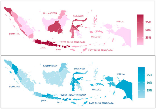 Maps showing the percentage of paddy field areas with high phosphorous (P) status (>174 mg kg−1 P) (upper) and the percentage of paddy field areas with high potassium (K) status (>166 mg kg−1 K) (lower) (adapted from Widowati et al., 2021) [26].