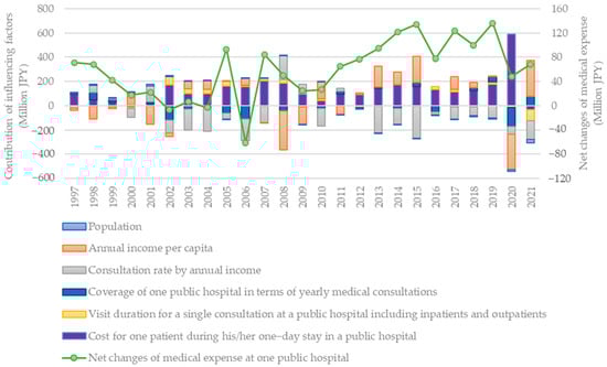 By applying LMDI method to decompose the annual changes during 1996–2021 in operating costs of public hospitals in Japan, this study indicates the following: the recent institutional reform of public hospitals in Japan succeeded in reducing needless medical demands on public hospitals and raised the charge income, which on average led to an annual reduction of operating costs by JPY 9 million per hospital during 1996–2021. However, the reform failed to suppress the rapid increments in salary costs, material costs, and medicine costs, which added an annual increment of JPY 127 million per hospital to the increasing operating costs. Beyond the institutional reform, increased material and medicine costs are also thought to have resulted from currency devaluation and worldwide inflation. In addition, historical changes in population and people’s overall consultation rates contributed an annual reduction of JPY 73 million per hospital. The COVID-19 pandemic shocked the healthcare system supported by public hospitals, but the impacts were internally offset among the factors.