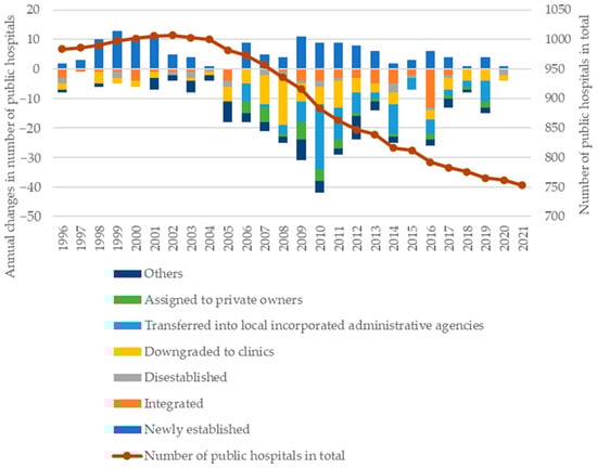 - The 2007 guideline for the institutional reform of public hospitals and the following updated 2015 reform plan established by the Japanese government had long-term comprehensive impacts on the number and scale, costs management, income system, and the consultation rate of public hospitals [32].