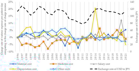 Next, the question as to whether the institutional integration of public hospitals failed in controlling the operating cost level was addressed. One simple test is to compare the change rate of charge income to that of operating costs. As can be seen from Figure 3, the changes in charge income level are closely correlated with the increases in salary costs. According to the statistics, the number of staff remained at 220,000 in the past, and the patient number per staff gradually decreased, but the average annual salary increased from JPY 8.33 to 9.24 million [24,56]. In addition, material costs, depreciation costs, and other incidental costs also generally followed the same path of annual changes as charge income. The only mismatch was with the medicine costs, which apparently increased more slowly than the charge income level before 2010, but gradually increased more rapidly than the latter from that point onward. In fact, the consumer price index was always around 95% during 1996–2013, and then slightly recovered to 100% afterwards as a result of monetary easing policy [58]. By contrast, the exchange rate of USD to JPY increased from approximately 80 to 120 during 2011–2021 [59]. Accordingly, the changes in unit material and medicine costs matched with the trend of JPY exchange rate very well. The medicine prices seemed to play an external role by affecting changes in the total operating cost of Japan’s public hospitals. It is not clear why the depreciation costs suddenly increased in year 2014, but generally they were prevented from contributing to the increase in total operating cost.