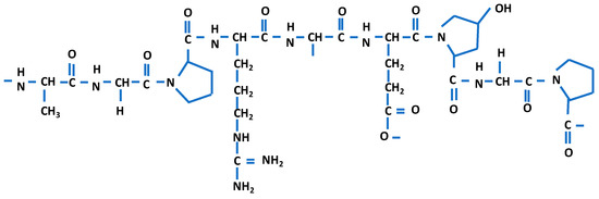Among the biopolymers derived from natural sources, polysaccharides attract a lot of attention due to their biomedical and physicochemical properties, such as biodegradability, biocompatibility, non-toxicity, renewability, and availability. Natural macromolecules, e.g., starch, gelatin, and collagen, are generally degraded in biological systems by a hydrolysis reaction and subsequent oxidation. Not surprisingly, most synthetic biodegradable polymers contain hydrolysable bonds along the polymer chain, e.g., amide, enamine, ester, urea, and urethane bonds, which can be biodegraded by microorganisms and hydrolytic enzymes. Since many proteolytic enzymes specifically catalyze the hydrolysis of peptide bonds adjacent to substituents in proteins, substituted polymers containing substituents such as benzyl, hydroxy, carboxy, methyl, and phenyl groups have been prepared in the hope that the introduction of these substituents may increase biodegradability [21]. In addition, most enzyme-catalyzed reactions take place in aqueous media, and the hydrophilic/hydrophobic nature of synthetic polymers has a significant impact on biodegradability. It appears that polymers containing both hydrophilic and hydrophobic segments are more biodegradable than polymers containing either only hydrophilic or only hydrophobic structures [3]. In view of this, the modification of textiles with biodegradable polymers is certainly an alternative to the usual textile treatments, in particular, the sol-gel process [22]. The sol-gel process offers great possibilities in terms of adaptability and the achievement of targeted modifications, albeit through the combination of different inorganic and organic starting materials. The sol-gel process, in its narrower sense, comprises hydrolysis and condensation reactions of metal alkoxides, whereby a continuous three-dimensional metal oxide network is formed [23]. The sol-gel process, like many other processes in the textile industry, essentially stands for the modification of textiles with synthetic compounds, while the modification of textiles with biopolymers represents a switch to sustainable, biodegradable, and natural polymers. Natural polymers have a much more complex structure than synthetic polymers, which have a relatively simple structure. The basic constitutional units of natural polymers are more complex than those of synthetic polymers, which affects the conformation and configuration of the macromolecules. This complexity of natural polymers offers a number of advantages in the modification of textiles with the aim of obtaining potentially biodegradable medical or cosmetic materials (for e.g., wound dressings). The general principle of action of most wound dressings is that they dissolve within 48 h on an open wound by interacting with microorganisms and other bodies [24]. In this way, they eliminate necrosis and promote the formation of “young skin”. Wound dressings are usually based on synthetic compounds, but they can also be based on bioderivative polymers and hydrogels, namely collagen and alginate. Collagen belongs to the group of multifunctional proteins most commonly found in bones, skin, tendons, and ligaments (Figure 1). The word “collagen” comes from the Greek words “kola”, which means gum, and “gen”, which means producing. Collagen is biodegradable and biocompatible, i.e., it rarely causes immune reactions in the body. It is therefore suitable in biomedicine for the production of implants and in various modifications as a carrier of biomass or as an active ingredient in a drug [25]. It is a component of dental composites, skin regeneration templates, and biodegradable matrices. Moreover, it is used in cardiovascular surgery, plastic surgery, orthopedics, urology, neurology, and ophthalmology [26]. Collagen can be extracted from natural animal and plant sources or obtained from recombinant protein production systems using bacteria, yeast, insects, plants, mammalian cells, or artificial fibrils [27]. The most common animal sources of collagen are human collagen, bovine collagen, porcine collagen, and fish collagen, with bovine collagen being widely used in collagen-based products. Collagen is a great protein that does not cause unwanted reactions in the body; it is sterile and contains no fever-producing substances; it does not cause allergic reactions on the skin (only in rare cases); it increases fibroblast production; it promotes platelet distribution at the site of injury; and it preserves leukocytes and macrophages. Collagen plays a crucial role in the wound healing process as it promotes cell proliferation, angiogenesis, and the deposition of collagen in the wound bed. In a chronic wound, the deposition of new collagen is delayed, and there are problems when certain processes delay healing. One of these processes is matrix metalloproteinase (MMP) [28]. Another important factor that can delay the healing process is the formation of a biofilm. The biofilm then protects the microorganisms from the body’s immune response and delays wound healing. Collagen as part of the wound dressing can create a moist healing environment that enables the wound to heal. It is able to inhibit or inactivate the MMPs while providing the enzymes with additional collagen sources so that the body’s own collagen can be utilized for new tissue growth. When collagen dressings are combined with silver or other active ingredients, they prevent biofilm from entering the wound bed and prevent infection. This was also the idea behind this work, but using only natural, biodegradable polymers and their combinations to achieve a synergistic approach.