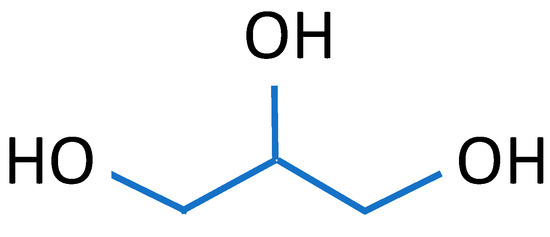Glycerol is the simplest trivalent alcohol (Figure 4). It is an essential component of compounds that build biological membranes and is found in all lipids (fats) of plant and animal origin. There are three types of glycerol: crude glycerol, which consists of about 40% to 88% water, and other impurities such as methanol, sodium chloride, sodium hydroxide, etc. The technical grade glycerol is about 95% to 98% pure and contains water and other impurities. It is mainly used for industrial manufacturing purposes [38]. The third grade is 99.7% pure and is referred to as glycerol with a safe, tested purity of up to 99.7%, which fulfills the requirements of the European Pharmacopoeia (PhEur), the US Pharmacopoeia (USP), and the Food Chemistry Code (FCC), contains no GMOs, and is gluten-free [39]. It is used in the cosmetics industry (creams, soaps, lotions, shower gels, etc.), in oral hygiene products (toothpaste, mouthwash, etc.), in the pharmaceutical industry (as a binder for tablets, in medicines for burns, bites, cuts, psoriasis, etc.), in the food industry (as a preservative—E422 and natural stabilizer), as an ingredient in e-liquid for e-cigarettes, etc. In this work, glycerol was used as a plasticizer and distilled water as a solvent. Given its properties, it is considered that it can contribute to the development of sustainable coatings as a potential equivalent active ingredient in wound dressings (it retains moisture, which is very important as wounds heal faster in a moist medium and complies with pharmacopoeia requirements).