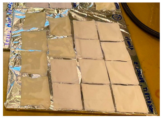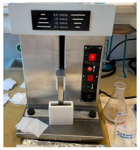 In the first step of the treatment with erythritol, a solution of distilled water, erythritol (bio&bio, Zagreb, Croatia), and propolis (Medex, Ljubljana, Slovenia) was prepared. The solution was mixed thoroughly. Then, glycerol, C3H8O3 (Gram-Mol, Zagreb, Croatia), was added dropwise to this solution, increasing the speed of mixing. The process was carried out under constant magnetic stirring until a homogeneous solution was obtained. In the second step, the 5 × 5 cm2 samples were coated using the dip coating method on a dip coater at a predetermined drawing speed of 1 mm s−1 to obtain a thin coating (Figure 5).