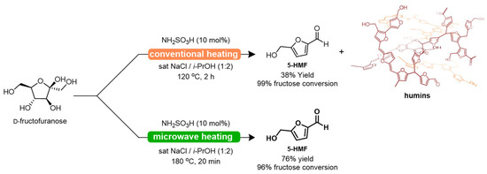 Generally, inorganic Brønsted–Lowry and Lewis acids are the most commonly investigated catalysts for converting fructose to 5-HMF [5]. Both homogeneous [6] and heterogeneous [7] catalysts are employed within aqueous monophasic or biphasic systems. Except for a few reported catalytic systems operating under lower temperatures [8,9,10], conversion of C6-sugars to 5-HMF requires high temperatures, commonly exceeding 120 °C, and relies predominantly on conventional heating methods.