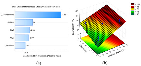 (a) Pareto chart of standardized effects for fructose conversion and (b) 3D response surface plot for predicted data for fructose conversion with a catalyst-to-fructose ratio fixed at 10 mol%.