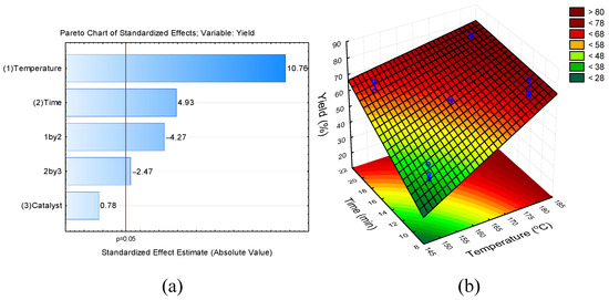 (a) Pareto chart of standardized effects at p-value = 0.05 for 5-HMF yield and (b) 3D response surface plot for predicted data for 5-HMF yield with a catalyst-to-fructose ratio fixed at 10 mol%.