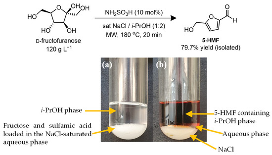 Also, after the standard procedure to recover 5-HMF from the reaction medium, 1H and 13C NMR analyses revealed that the product was isolated in high purity (Supplementary Material Figures S12 and S13). No by-products, such as isopropyl ether derivatives, formed by the etherification reaction with the solvent i-PrOH were detected [33]. Additionally, under the optimized reaction conditions, the measured pH of the aqueous phase was determined to be 2.0. This benign acidic condition may also play a role in avoiding the formation of the 5-HMF rehydrated by-products LA and FA, as previously observed [14].