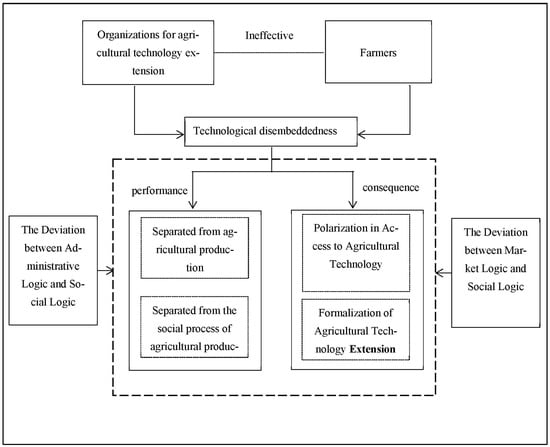 In examining the case analysis, three key aspects have surfaced, each revealing profound insights into the repercussions of the evolving landscape of agricultural technology extension. Two primary research conclusions emerge prominently. Firstly, the detachment of agricultural technology extension from the actual processes of agricultural production is evident. Secondly, there is a discernible disconnection between agricultural technology extension and the broader social fabric of agriculture. Additionally, the examination exposes a consequential negative outcome stemming from this technological disembedding. The overarching pattern that emerges is one of technological disembeddedness, as illustrated in Figure 4.